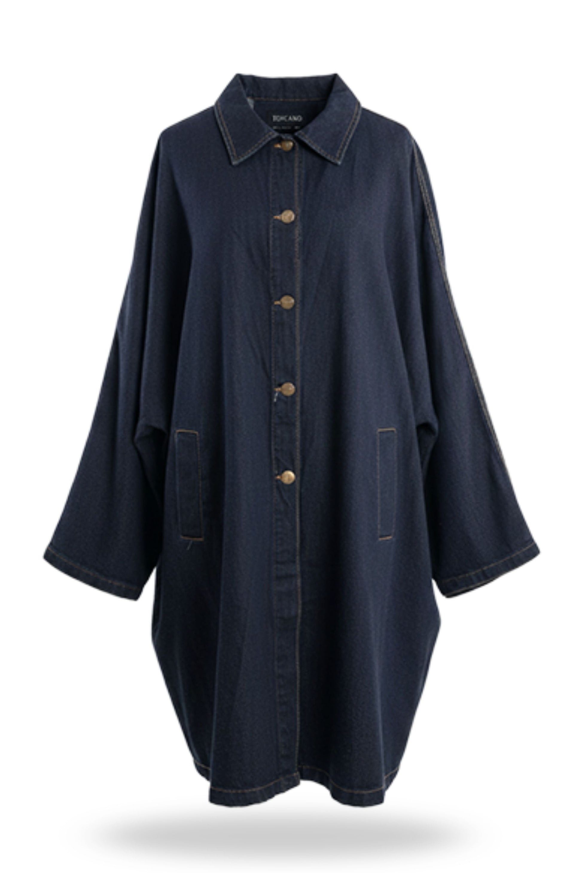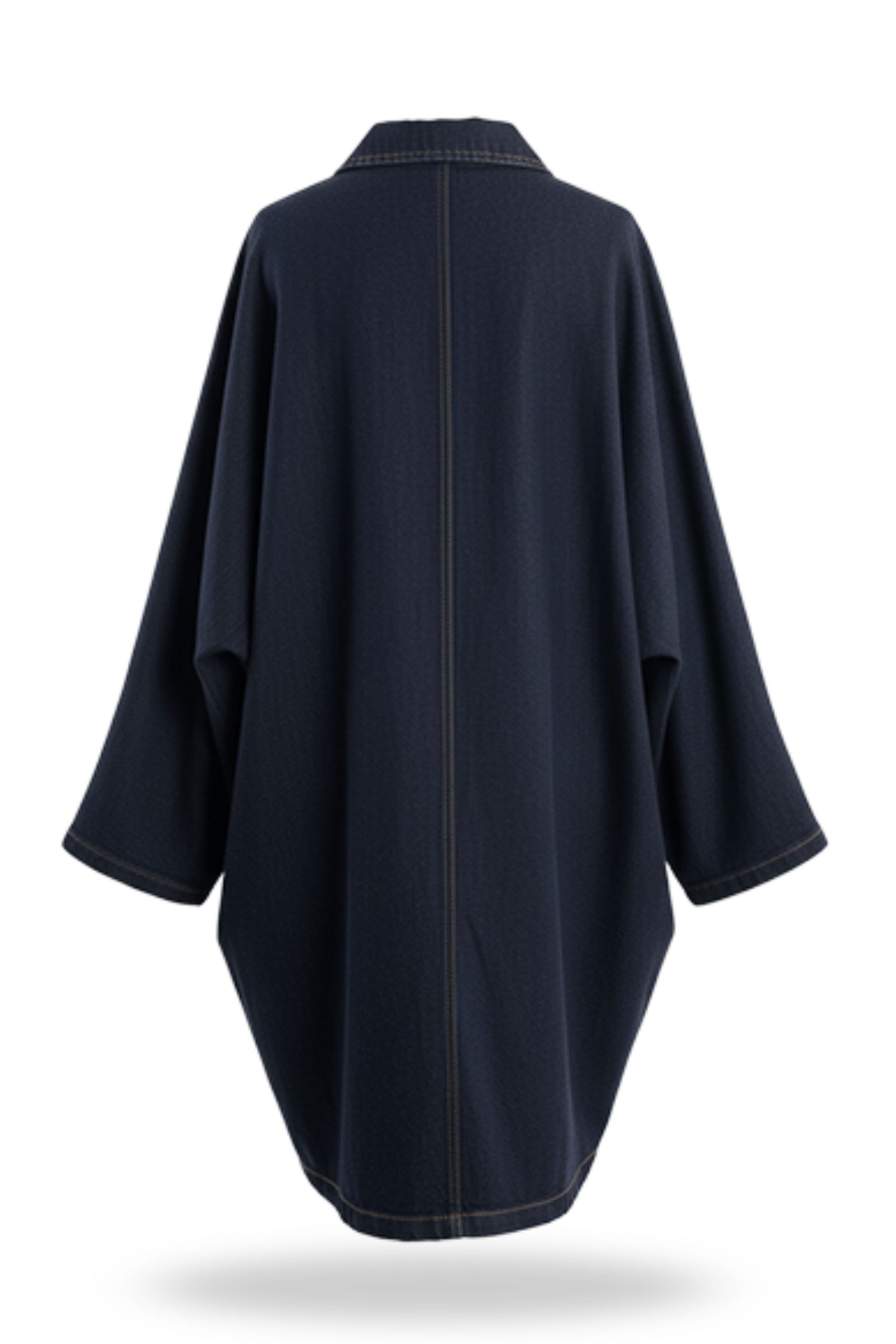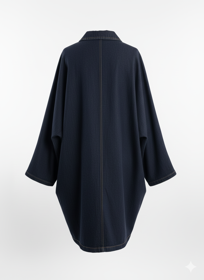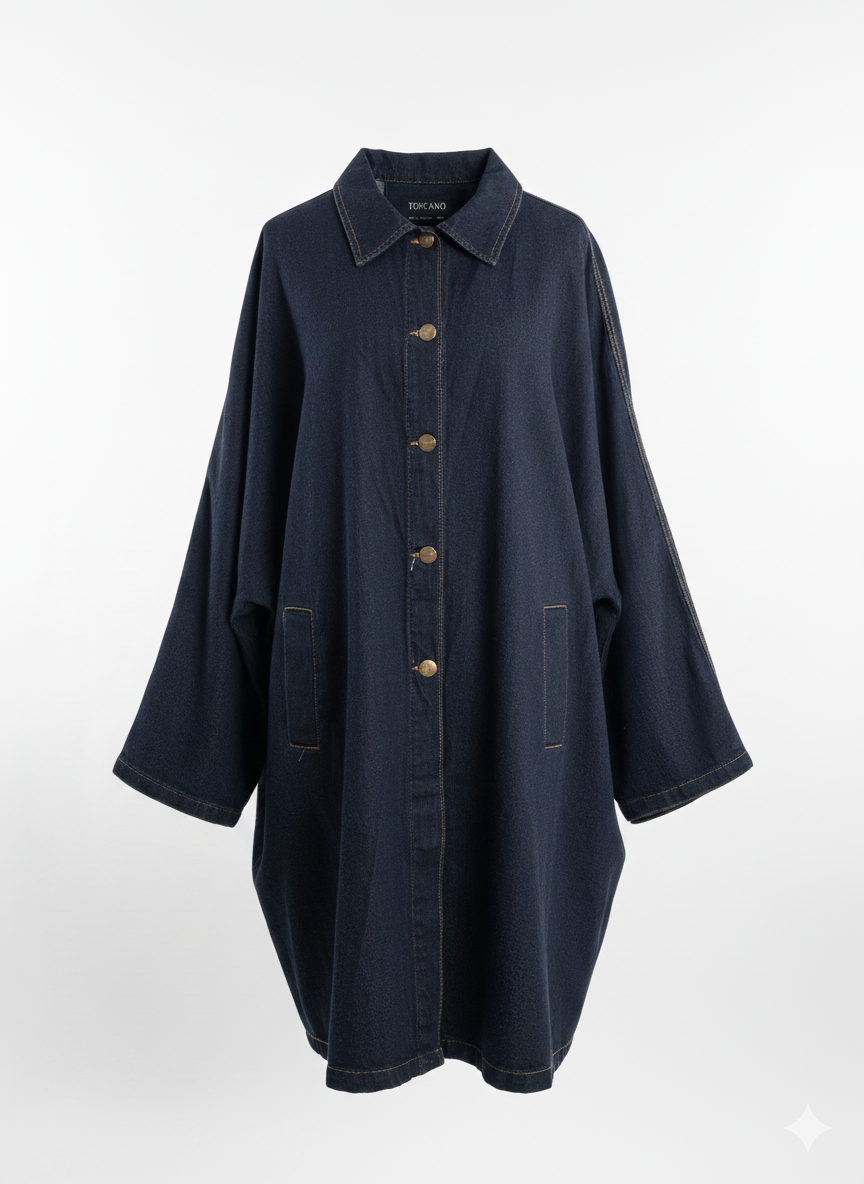 Abrigo de color índigo profundo. Esta pieza se distingue por su corte largo, oversize y su silueta relajada, que la convierte en una prenda ideal para superponer. Presenta un cuello clásico de camisa, cierre de botones metálicos y mangas con amplias que le otorgan un aire escultural y moderno. Su tipo de tela aporta durabilidad y un acabado lujoso y atemporal, elevando esta prenda exterior a un nivel de sofisticación casual.