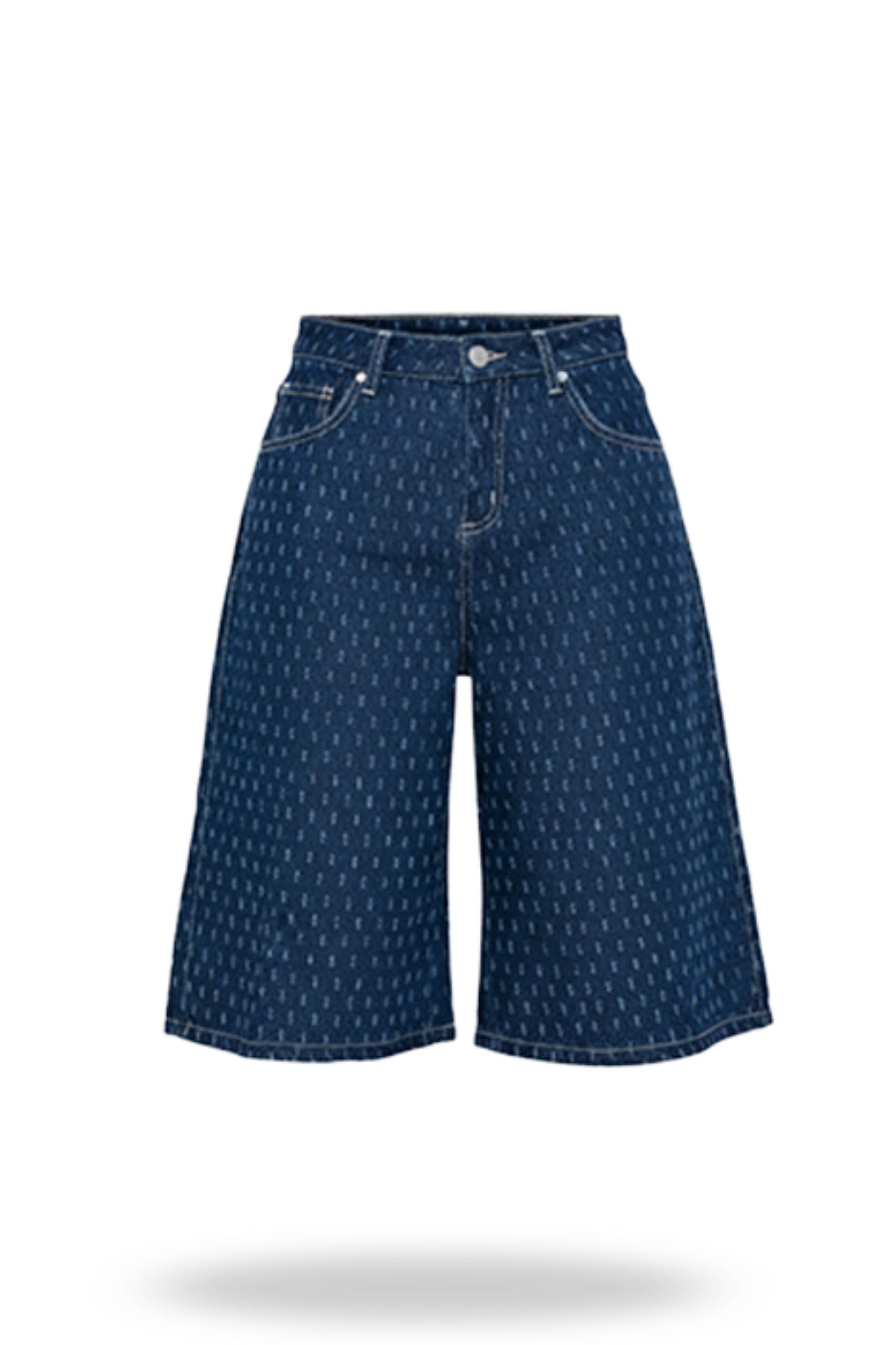 Bermuda de corte recto y midi, confeccionada en denim con detalles en corte láser en contraste. Su diseño de tiro medio/alto y largo a la rodilla ofrece un equilibrio perfecto entre lo casual y lo sartorial. Es una prenda cómoda y moderna, ideal para crear looks de día que requieren un toque de originalidad.
