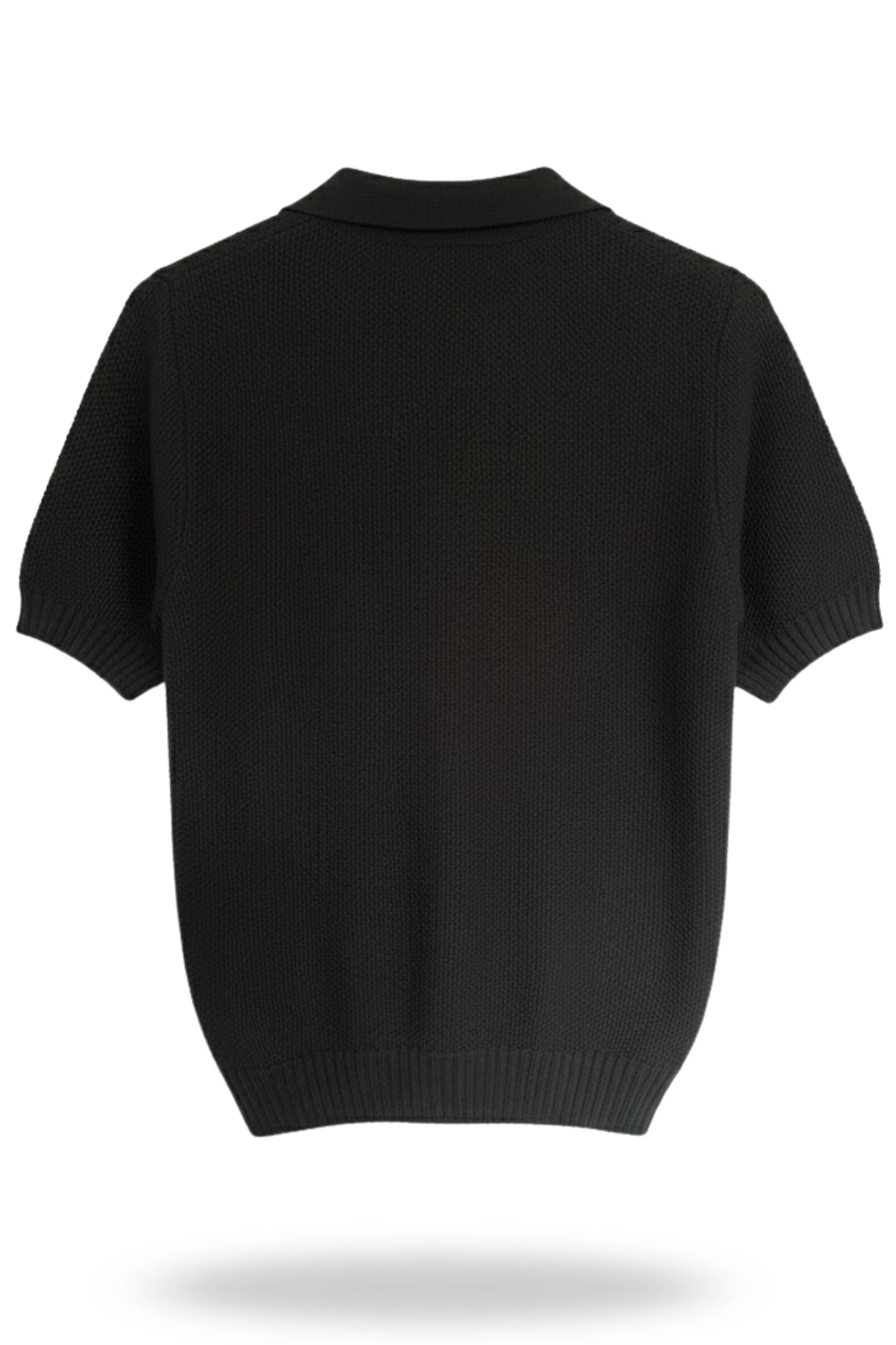 Polo de corte relajado confeccionado en tejido de punto texturizado en color negro. Su diseño destaca por el cuello tipo polo con escote en V y la textura sutil del tejido, que le da un aire más formal que una camiseta de algodón clásica. Los puños y el bajo son acanalados, lo que ayuda a definir su silueta. Es un básico elevado y sofisticado ideal para looks de día o de noche.