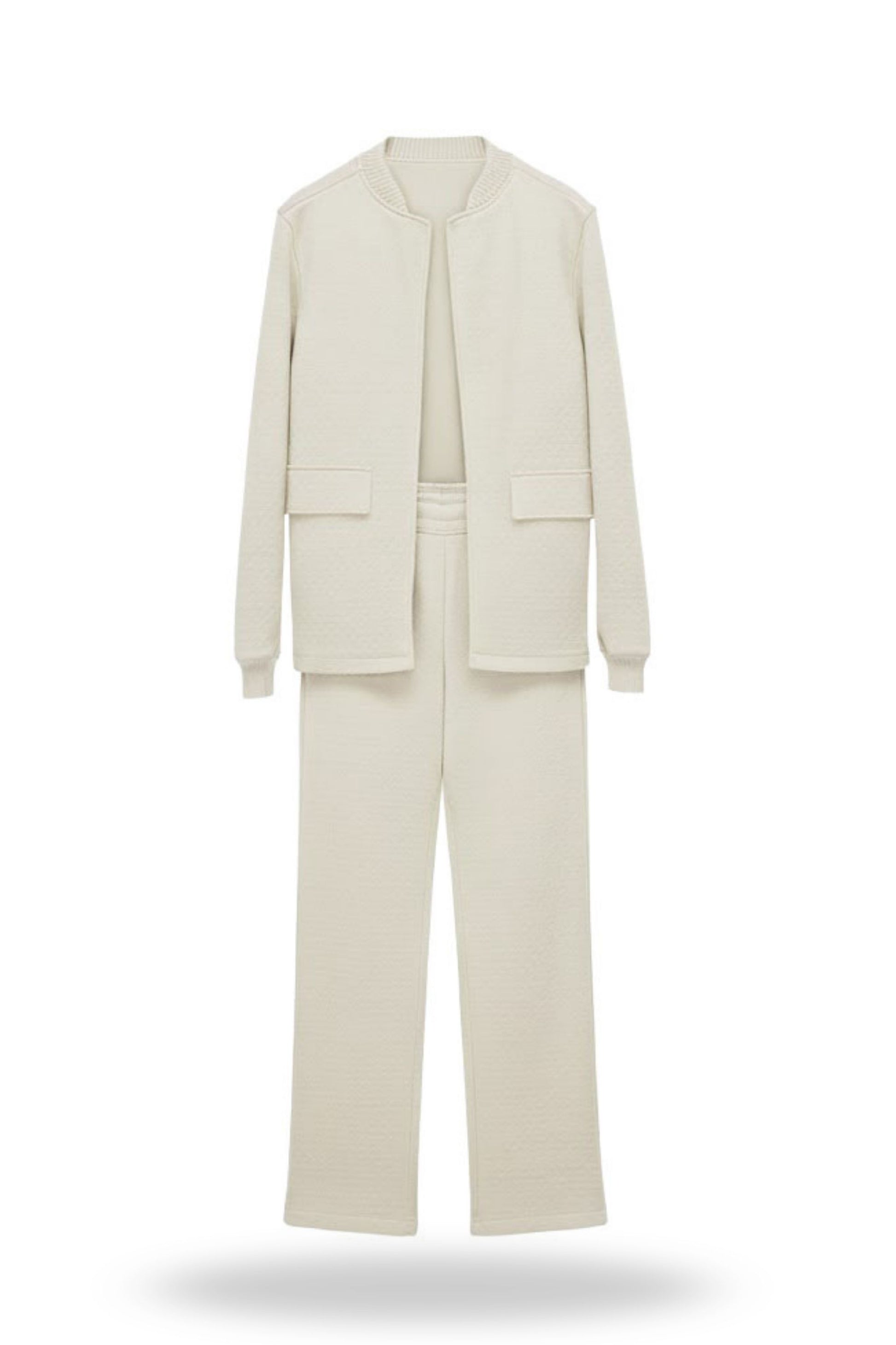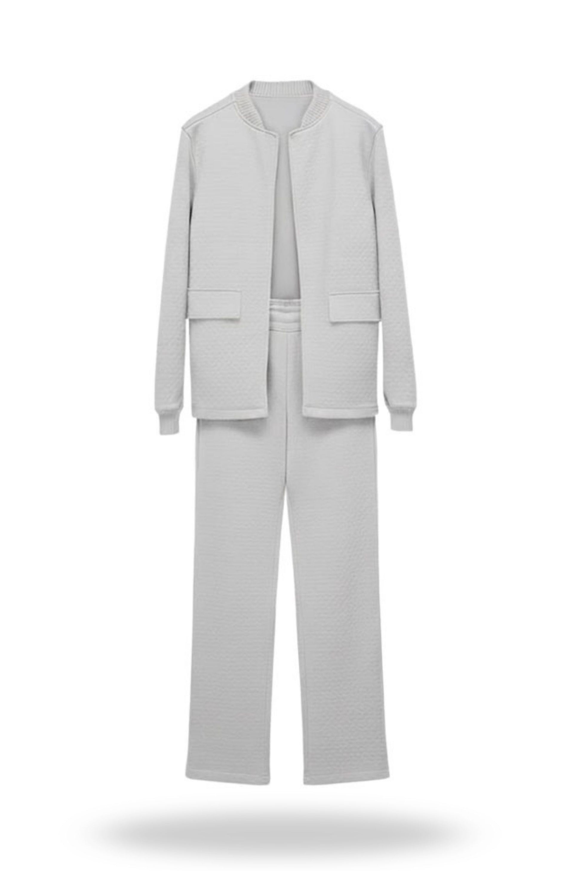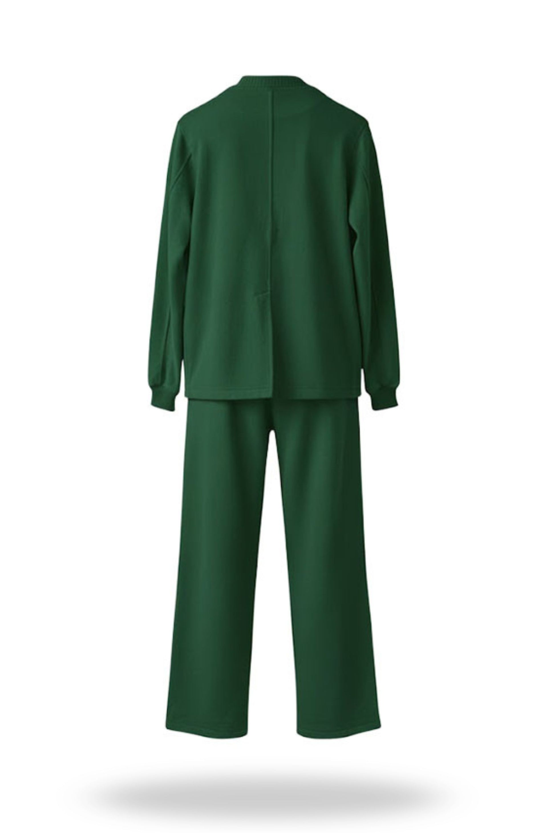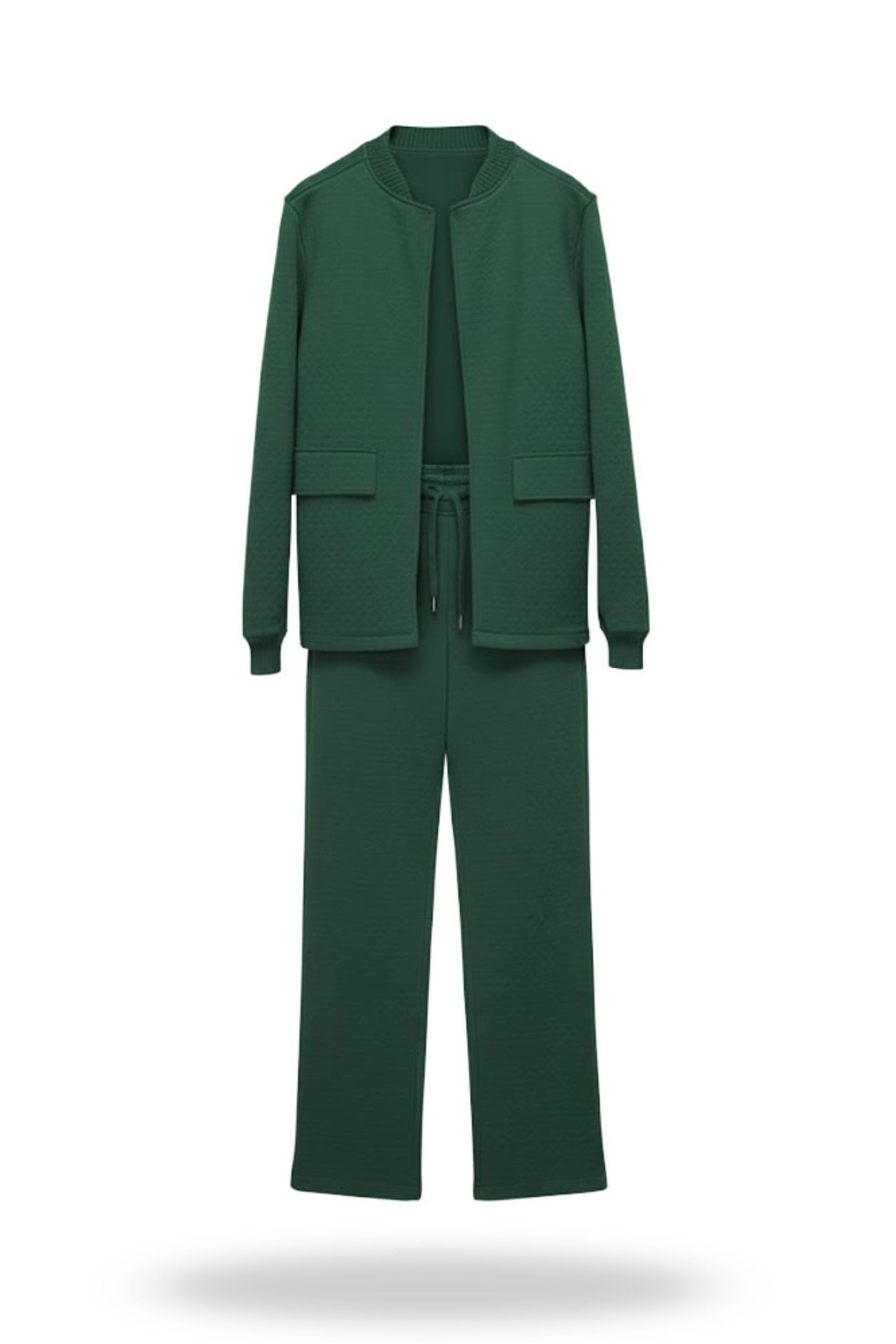 Set de dos piezas confeccionado en paño de algodón reciclado, una tela que ofrece la calidez y comodidad del algodón con una estructura suave y definida. La chaqueta estilo bomber larga presenta un diseño atemporal con cuello redondo, rib en puños y un corte relajado que favorece la silueta, ideal para superponer. El pantalón, de corte recto y holgado, cuenta con una cintura elástica y cordón ajustable para un ajuste cómodo. La textura de paño y su color intenso aportan un aire de lujo discreto y contemporáneo, convirtiéndolo en un conjunto versátil y moderno, perfecto para elevar cualquier look casual.
