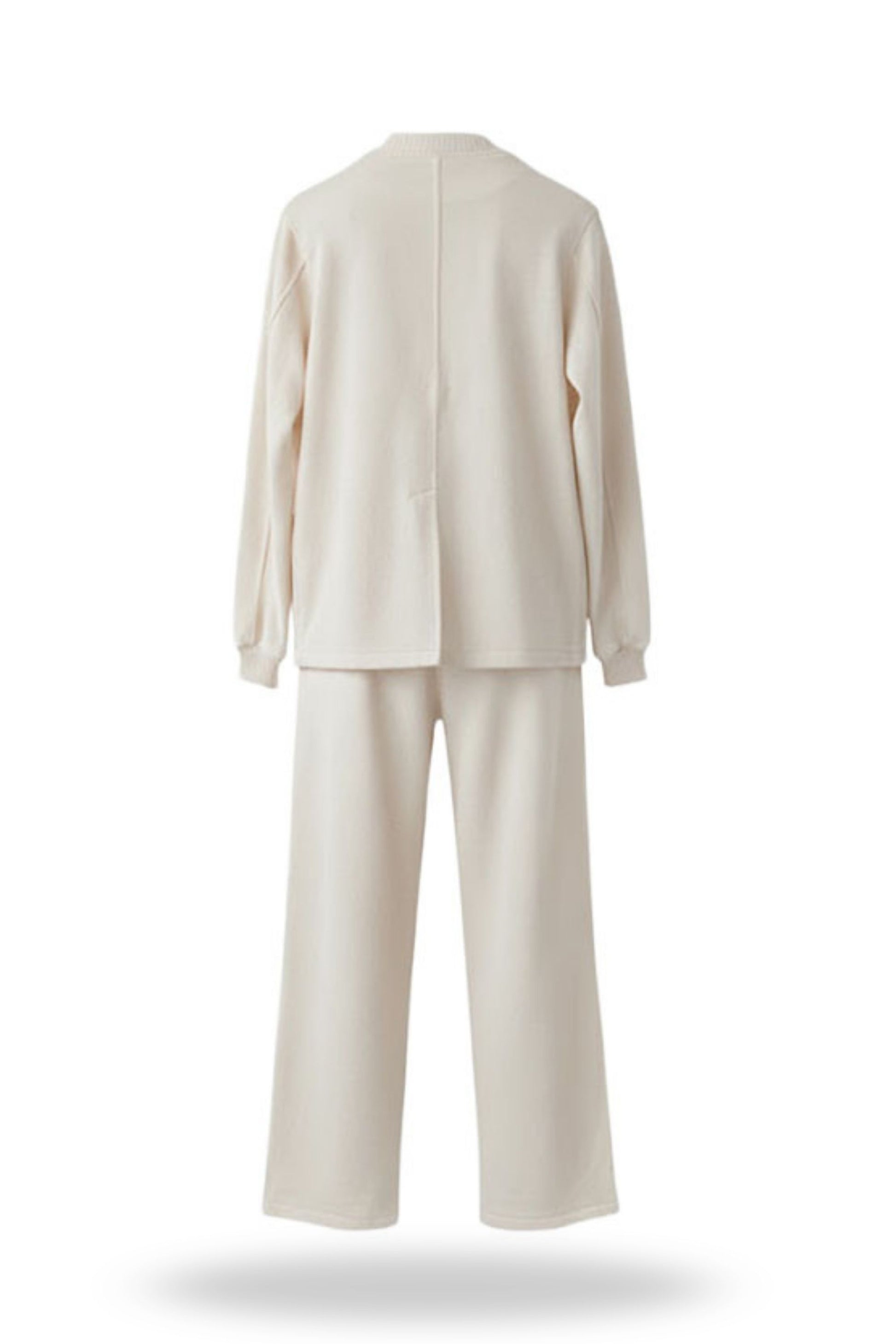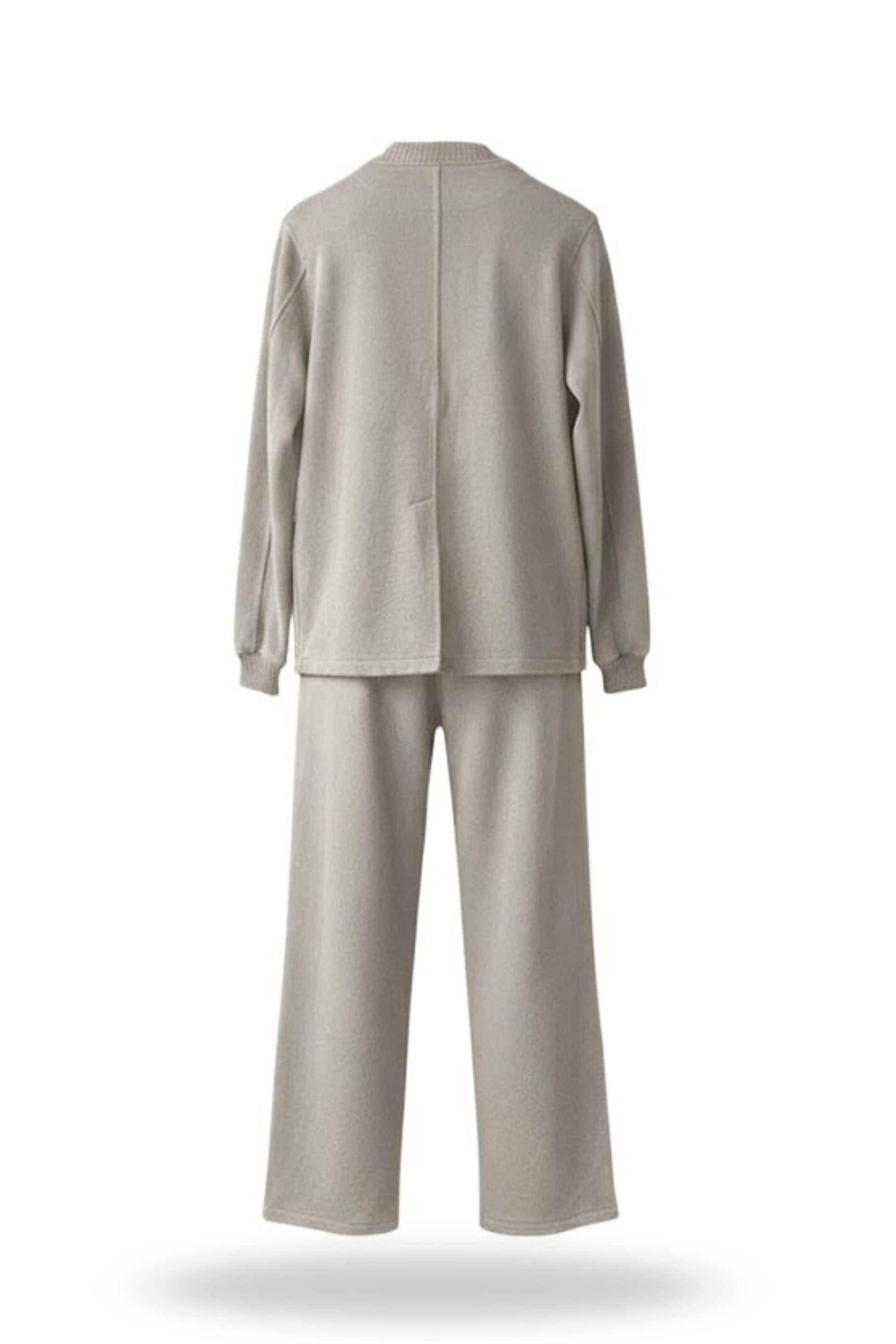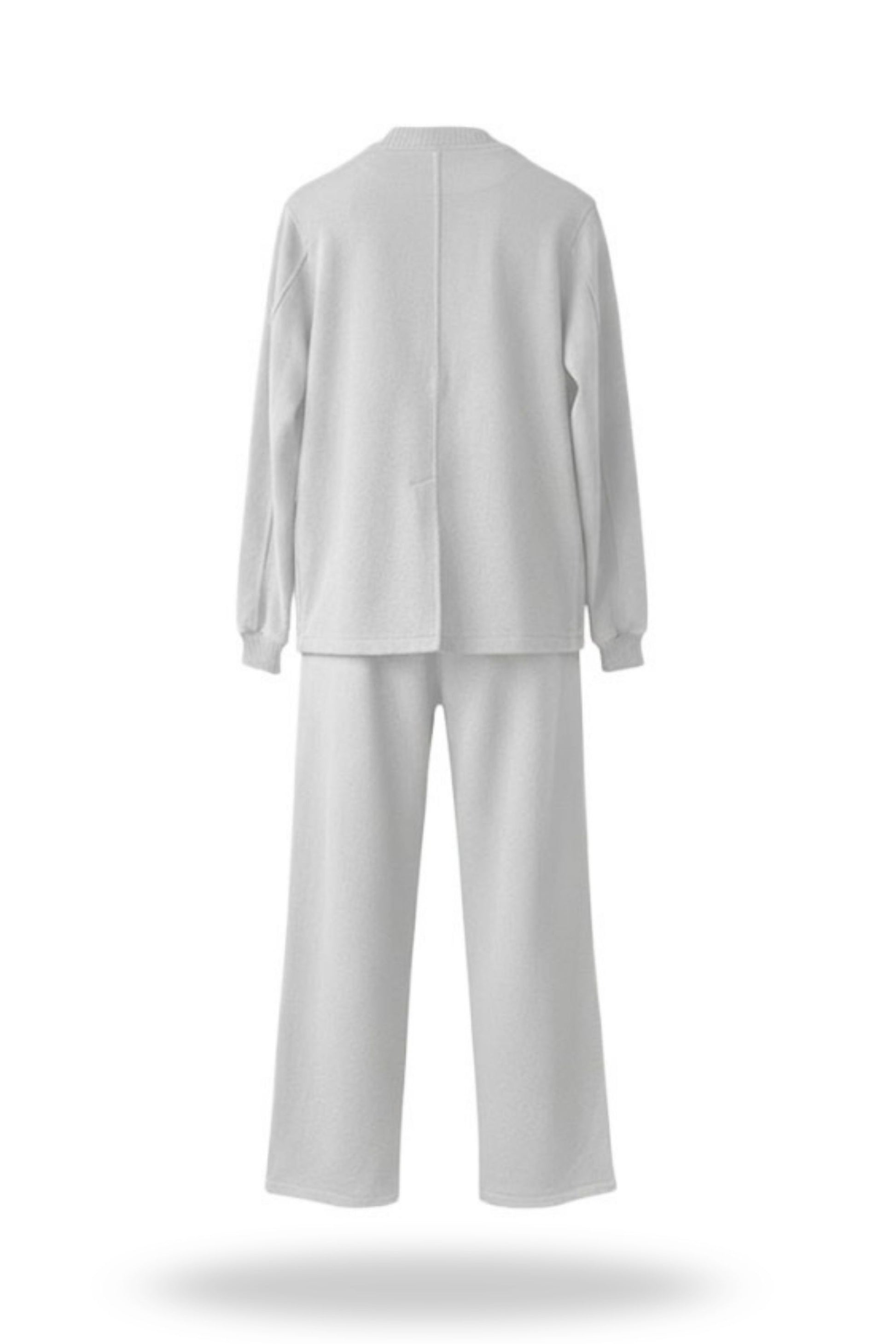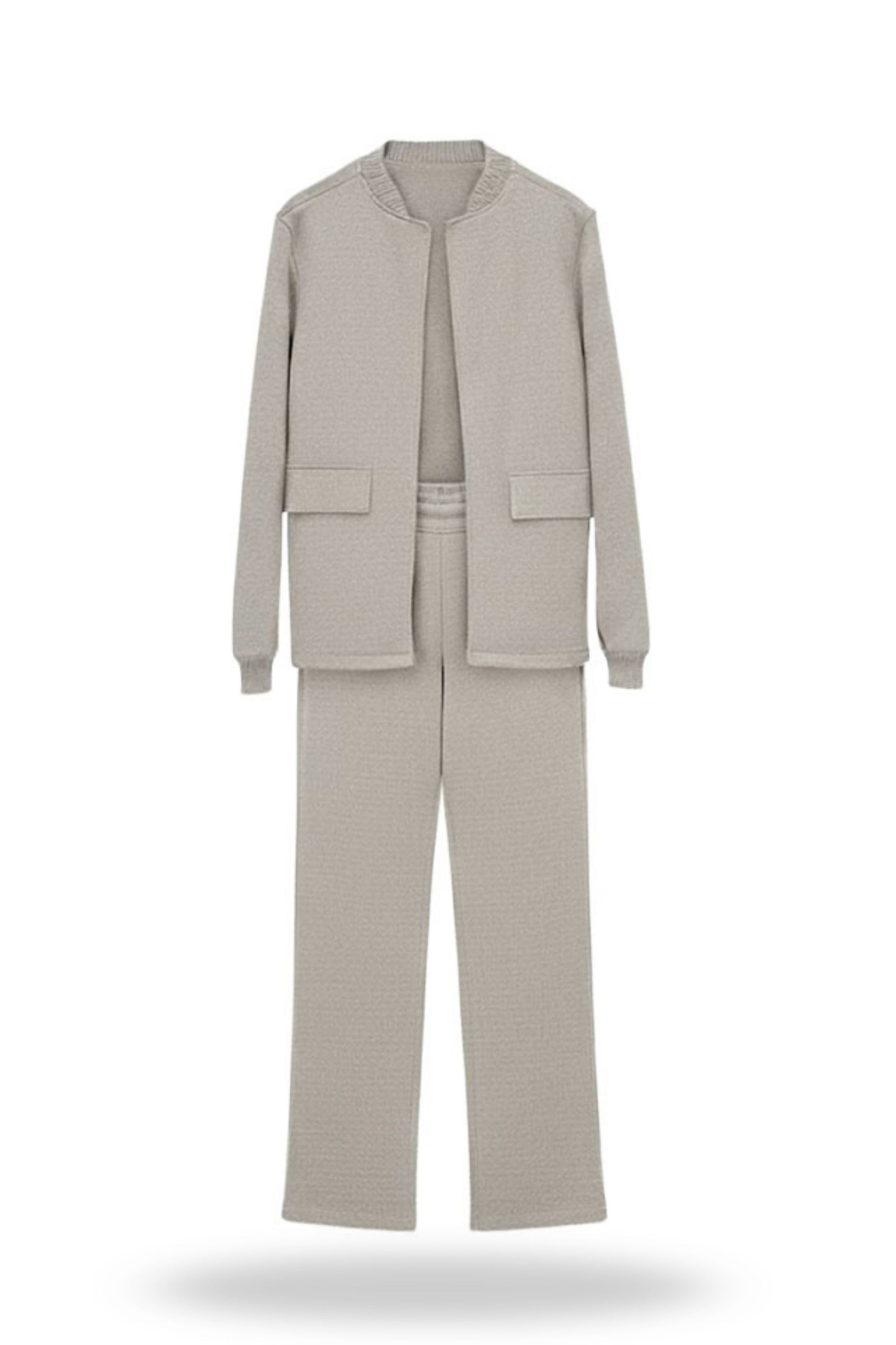 Set de dos piezas confeccionado en paño de algodón reciclado, una tela que ofrece la calidez y comodidad del algodón con una estructura suave y definida. La chaqueta estilo bomber larga presenta un diseño atemporal con cuello redondo, rib en puños y un corte relajado que favorece la silueta, ideal para superponer. El pantalón, de corte recto y holgado, cuenta con una cintura elástica y cordón ajustable para un ajuste cómodo. La textura de paño y su color intenso aportan un aire de lujo discreto y contemporáneo, convirtiéndolo en un conjunto versátil y moderno, perfecto para elevar cualquier look casual.